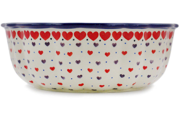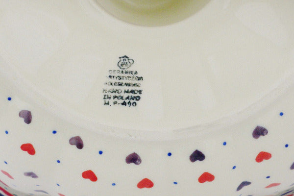 This Polish pottery Cake Mould is made by Ceramika Artystyczna workshop in Boleslawiec, Poland. Manufacturer item number H2991R. It is 3¾" high and measures 10½" by 10½". The capacity of this Cake Mould is 86.1 oz when filled to rim and it weighs 4.1 lbs. It is part of the Red Hearts Delight Collection.