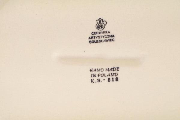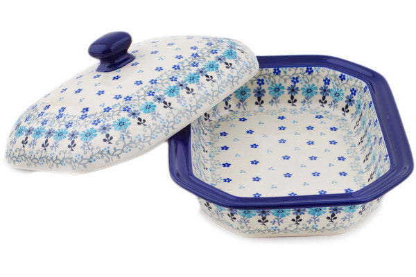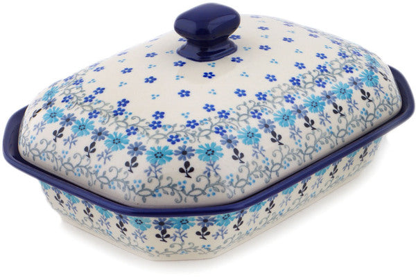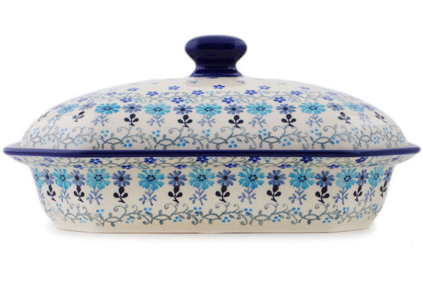 This Polish pottery Dish with Cover is made by Ceramika Artystyczna workshop in Boleslawiec, Poland. Manufacturer item number H6449Q. It is 4¾" high and measures 10¼" by 8". The capacity of this Dish with Cover is 32.5 oz when filled to rim and it weighs 3.5 lbs. It is part of the Baby Blue Garden Collection.