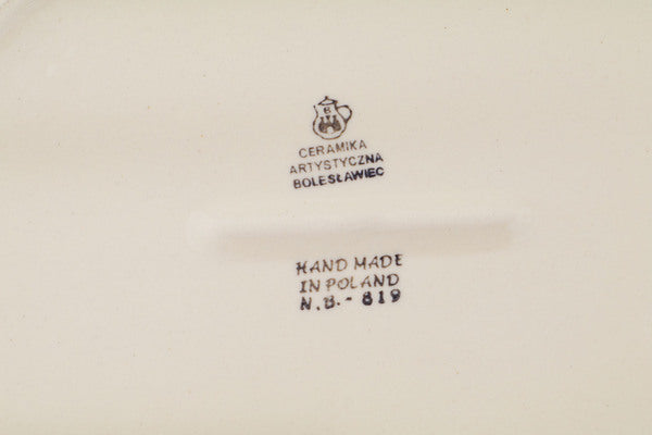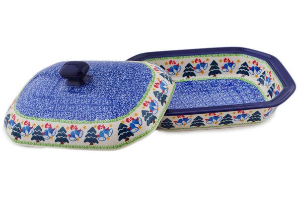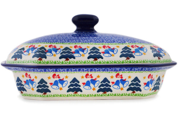 This Polish pottery Dish with Cover is made by Ceramika Artystyczna workshop in Boleslawiec, Poland. Manufacturer item number H5288Q. It is 4¾" high and measures 10¼" by 8". The capacity of this Dish with Cover is 32.5 oz when filled to rim and it weighs 3.5 lbs. The pattern was designed by artist Wirginia Cebrowska. It is part of the Christmas Bells Ring Collection.