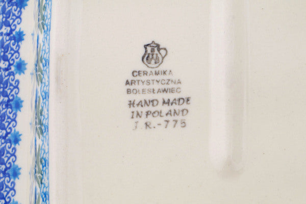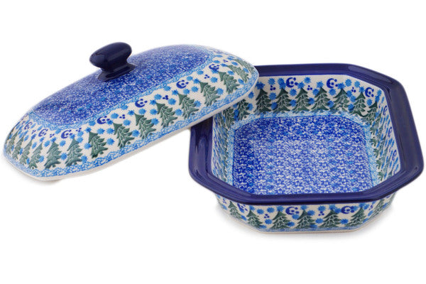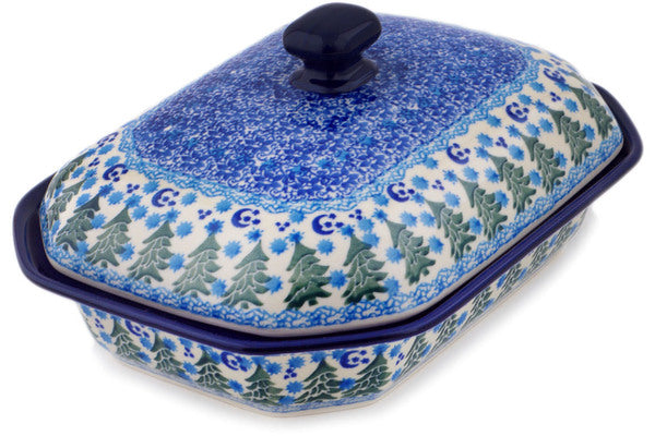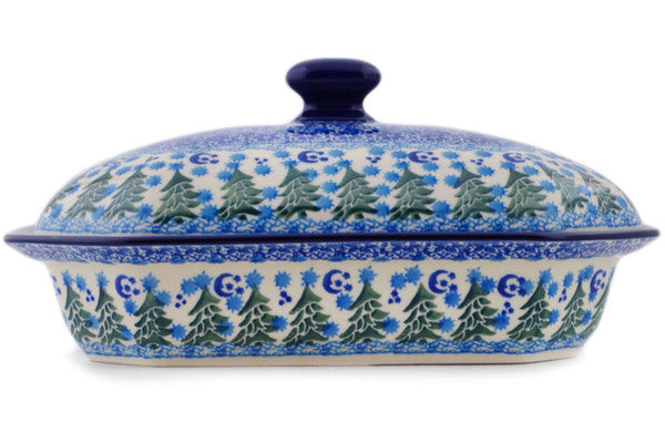 This Polish pottery Dish with Cover is made by Ceramika Artystyczna workshop in Boleslawiec, Poland. Manufacturer item number H5280Q. It is 4¾" high and measures 10¼" by 8". The capacity of this Dish with Cover is 32.5 oz when filled to rim and it weighs 3.5 lbs. It is part of the Evergreen Night Collection.