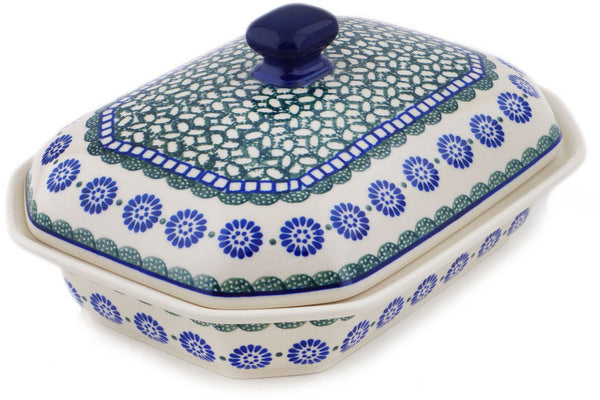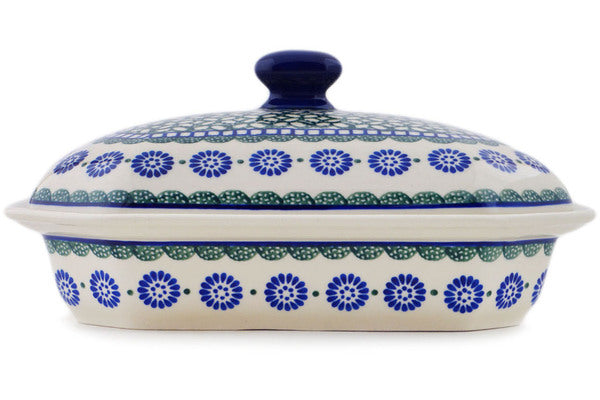This Polish pottery Dish with Cover is made by Ceramika Artystyczna workshop in Boleslawiec, Poland. Manufacturer item number H5616Q. It is 4¾" high and measures 10¼" by 8". The capacity of this Dish with Cover is 32.5 oz when filled to rim and it weighs 3.5 lbs. The pattern was designed by artist Teresa Liana. It is part of the Maia Collection.