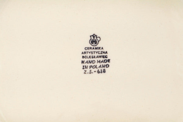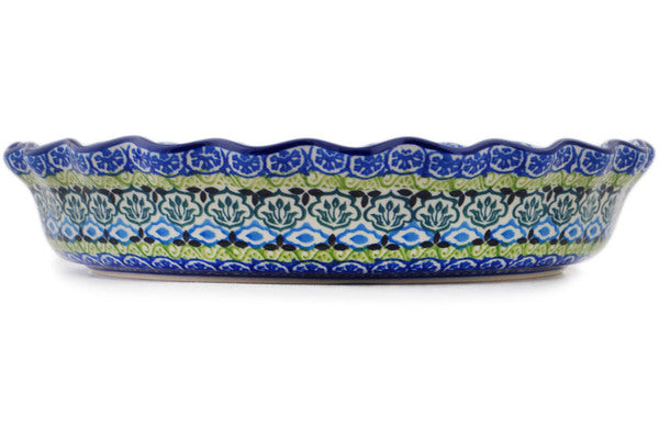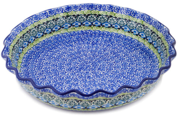 This Polish pottery Fluted Pie Dish is made by Ceramika Artystyczna workshop in Boleslawiec, Poland. Manufacturer item number H5697Q. It is 2" high and measures 10¼" by 10¼". The capacity of this Fluted Pie Dish is 46.7 oz when filled to rim and it weighs 2.4 lbs. The pattern was designed by artist Maria Starzyk. It is part of the Artistic Boho Collection.