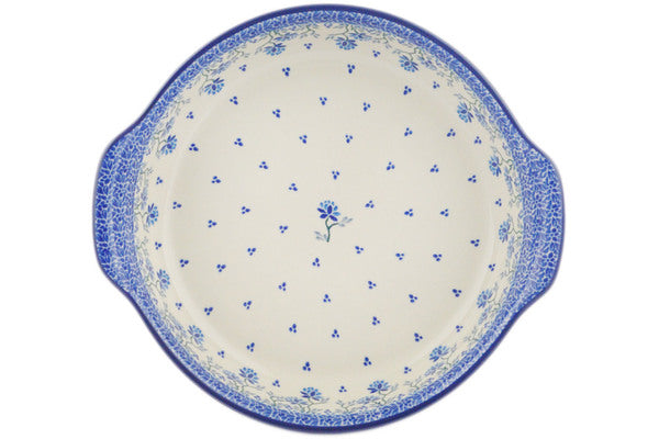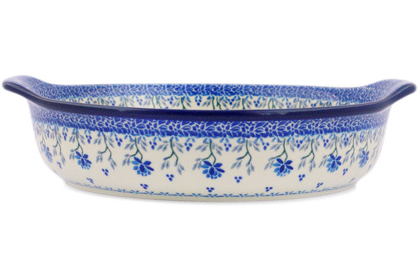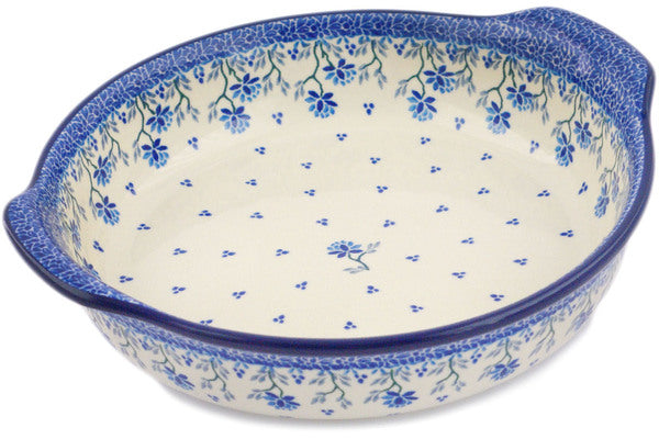 This Polish pottery Round Baker with Handles is made by Ceramika Artystyczna workshop in Boleslawiec, Poland. Manufacturer item number H6277Q. It is 2¼" high and measures 11¼" by 10¼". The capacity of this Round Baker with Handles is 64.2 oz when filled to rim and it weighs 2.5 lbs. It is part of the Blue Grapevine Collection.