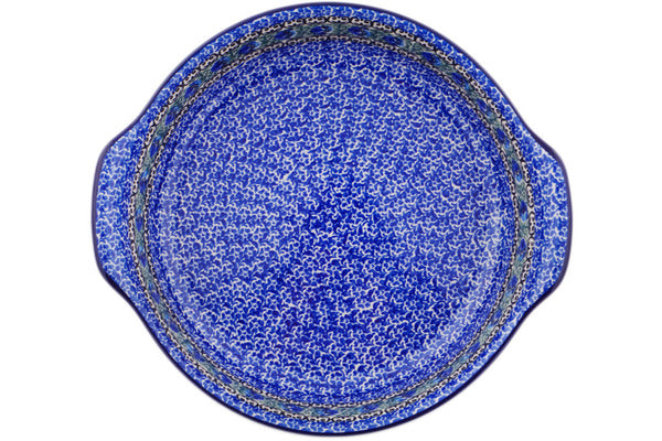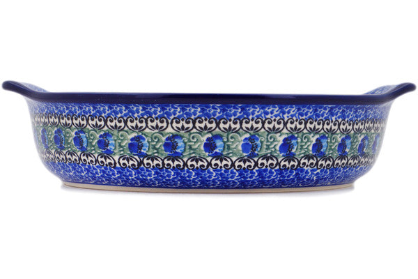 This Polish pottery Round Baker with Handles is made by Ceramika Artystyczna workshop in Boleslawiec, Poland. Manufacturer item number H5389Q. It is 2¼" high and measures 11¼" by 10¼". The capacity of this Round Baker with Handles is 64.2 oz when filled to rim and it weighs 2.5 lbs. The pattern was designed by artist Teresa Liana. It is part of the Peacock Feather Collection.