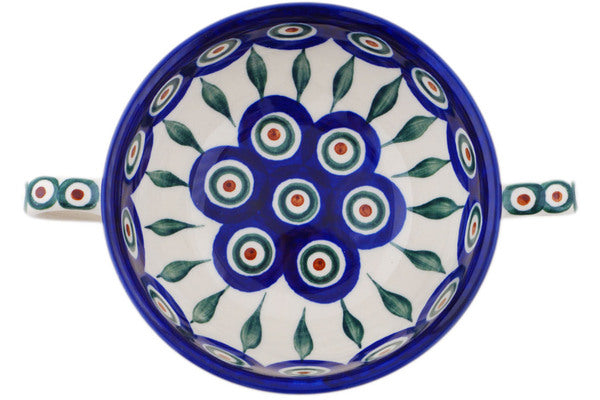 This Polish pottery Bouillon Cup is made by Ceramika Artystyczna workshop in Boleslawiec, Poland. Manufacturer item number H1663Q. It is 2" high and measures 6¾" by 4¾". The capacity of this Bouillon Cup is 10.1 oz when filled to rim and it weighs 0.7 lbs. The pattern was designed by artist Muzealna. It is part of the Peacock Leaves Collection.