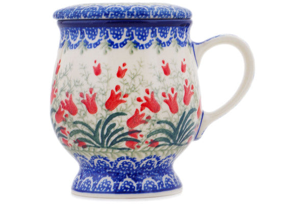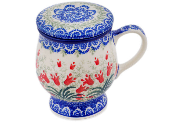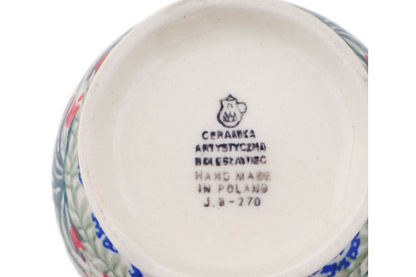 This Polish pottery Cup is made by Ceramika Artystyczna workshop in Boleslawiec, Poland. Manufacturer item number H1486Q. It is 4¼" high and measures 4¾" by 3½". The capacity of this Cup is 9.7 oz when filled to rim and it weighs 0.9 lbs. The pattern was designed by artist Jolanta Okraska. It is part of the Crimson Bells Collection.