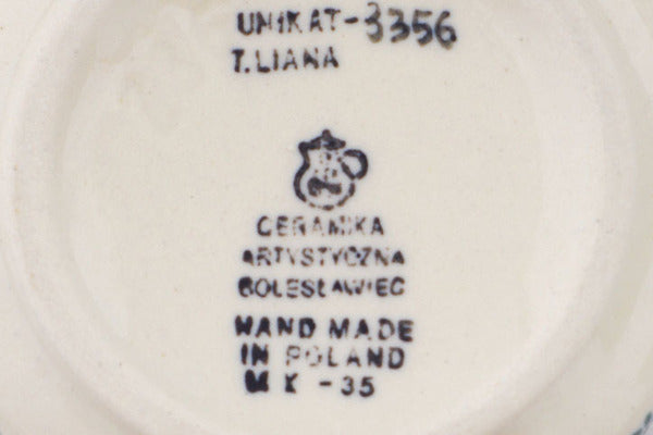 This is a Polish pottery Unikat (Signature) Mug, which means that it has been hand painted with both sponges and brushes and it is signed by the artist who painted it. Unikat pieces are the most intricate works of art. Larger Unikat items take hours of very careful work to finish.