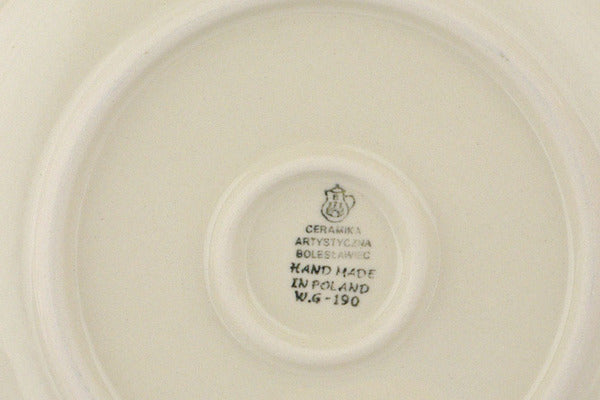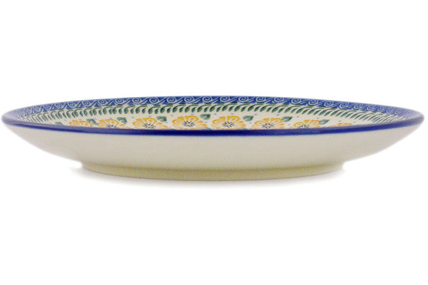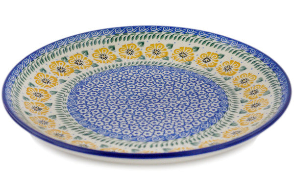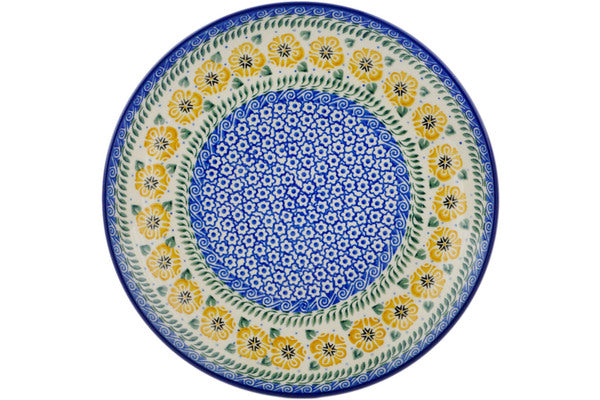 This Polish pottery Plate is made by Ceramika Artystyczna workshop in Boleslawiec, Poland. Manufacturer item number H2261R. It is 1¼" high and measures 10" by 10". The weight of this Plate is 1.5 lbs. The pattern was designed by artist Maria Starzyk. It is part of the Marigold Morning Collection.