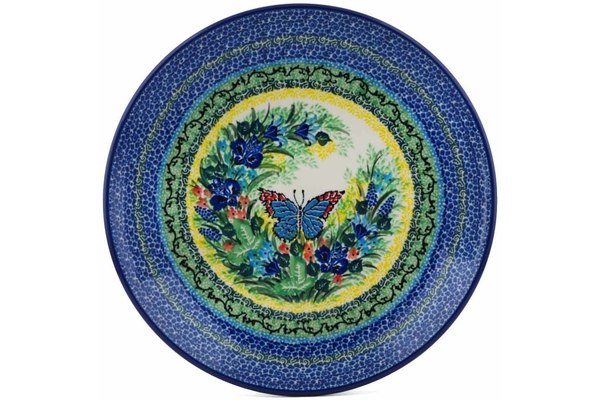 This Polish pottery Plate is made by Ceramika Artystyczna workshop in Boleslawiec, Poland. Manufacturer item number H3999H. It is 1¼" high and measures 10" by 10". The weight of this Plate is 1.5 lbs. The pattern was designed by artist Teresa Liana. It is part of the Splendid Mariposa Collection.