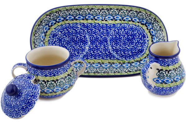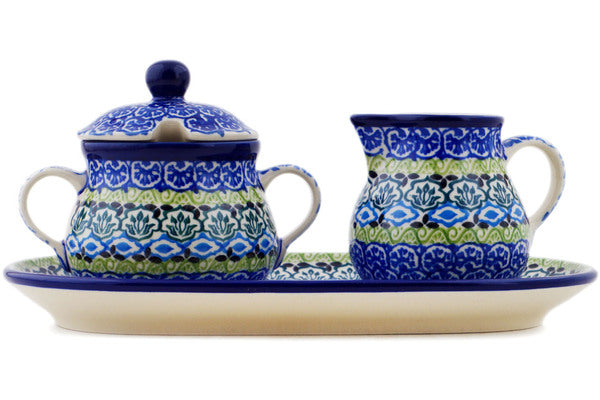 This Polish pottery Sugar and Creamer Set is made by Ceramika Artystyczna workshop in Boleslawiec, Poland. Manufacturer item number H5695Q. It is 4¼" high and measures 9¾" by 5". The weight of this Sugar and Creamer Set is 2.0 lbs. The pattern was designed by artist Maria Starzyk. It is part of the Artistic Boho Collection.