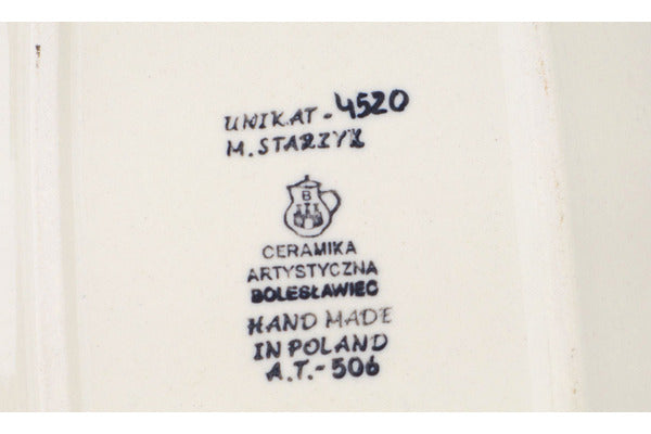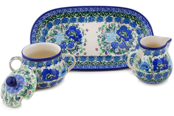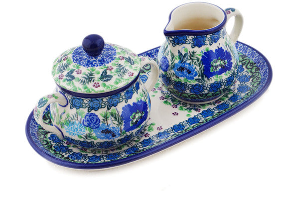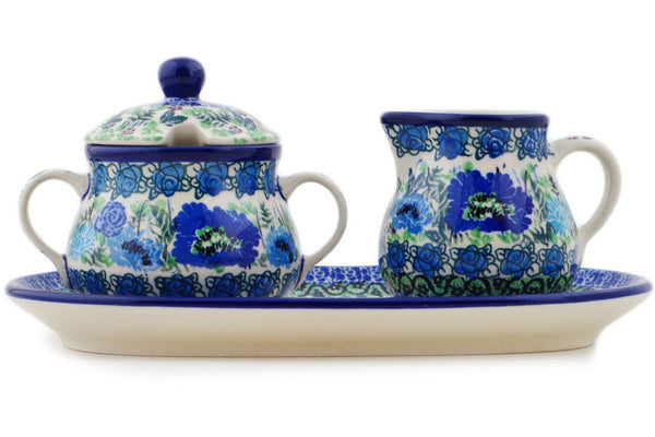 This Polish pottery Sugar and Creamer Set is made by Ceramika Artystyczna workshop in Boleslawiec, Poland. Manufacturer item number H6860Q. It is 4¼" high and measures 9¾" by 5". The weight of this Sugar and Creamer Set is 2.0 lbs. The pattern was designed by artist Maria Starzyk. It is part of the Blue Meadow Collection.