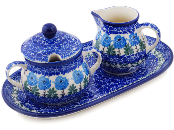 Polish Pottery 10" Sugar and Creamer Set Blue Rosette Wreath