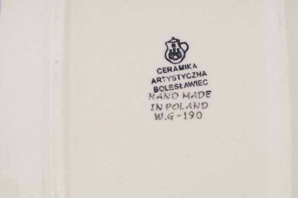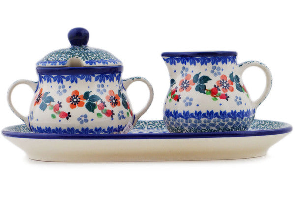 This Polish pottery Sugar and Creamer Set is made by Ceramika Artystyczna workshop in Boleslawiec, Poland. Manufacturer item number H5952Q. It is 4¼" high and measures 9¾" by 5". The weight of this Sugar and Creamer Set is 2.0 lbs. It is part of the Budding Blossom Collection.
