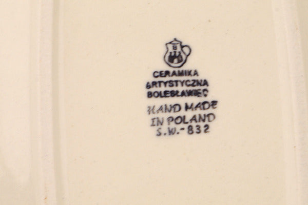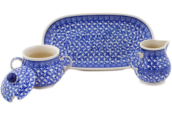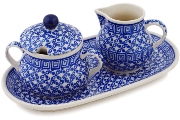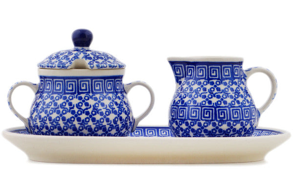 This Polish pottery Sugar and Creamer Set is made by Ceramika Artystyczna workshop in Boleslawiec, Poland. Manufacturer item number H4929Q. It is 4¼" high and measures 9¾" by 5". The weight of this Sugar and Creamer Set is 2.0 lbs. It is part of the Grecian Vines Collection.