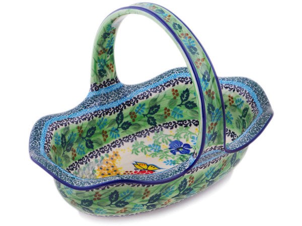 This Polish pottery Basket with Handle is made by Ceramika Artystyczna workshop in Boleslawiec, Poland. Manufacturer item number H6629Q. It is 8" high and measures 11" by 7½". The weight of this Basket with Handle is 2.7 lbs. The pattern was designed by artist Teresa Liana. It is part of the Spring Garden Collection.