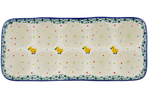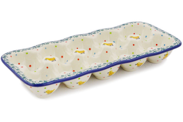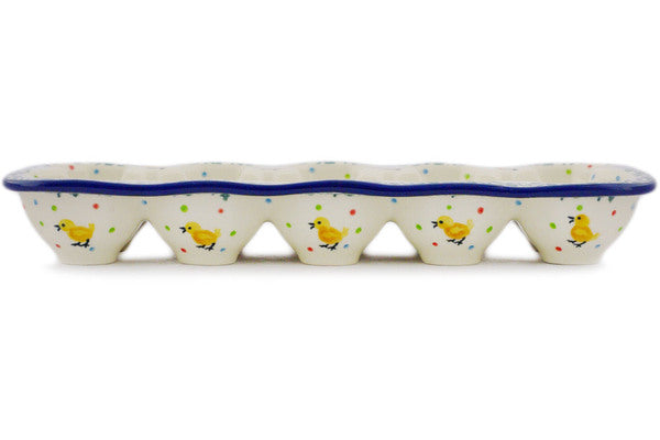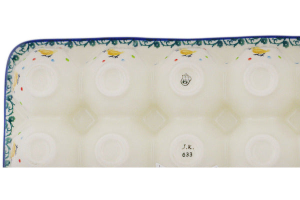 This Polish pottery Egg Crate is made by Ceramika Artystyczna workshop in Boleslawiec, Poland. Manufacturer item number H9085Q. It is 1½" high and measures 11" by 4¾". The capacity of this Egg Crate is 13.1 oz when filled to rim and it weighs 1.5 lbs.