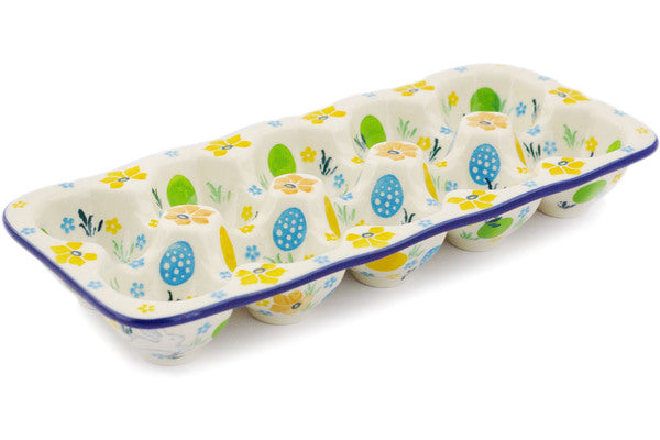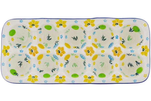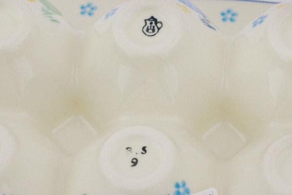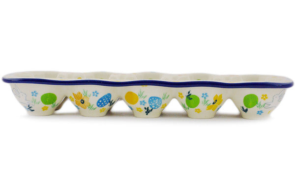 This Polish pottery Egg Crate is made by Ceramika Artystyczna workshop in Boleslawiec, Poland. Manufacturer item number H9255Q. It is 1½" high and measures 11" by 4¾". The capacity of this Egg Crate is 13.1 oz when filled to rim and it weighs 1.5 lbs. It is part of the Egg Hunt Collection.
