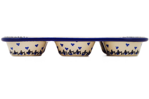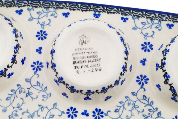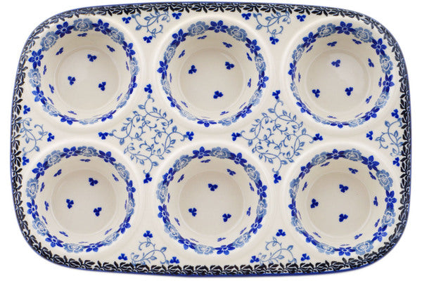 This Polish pottery Muffin Pan is made by Ceramika Artystyczna workshop in Boleslawiec, Poland. Manufacturer item number H6002Q. It is 1½" high and measures 11½" by 8". The capacity of this Muffin Pan is 17.6 oz when filled to rim and it weighs 2.7 lbs. It is part of the First Snow Collection.