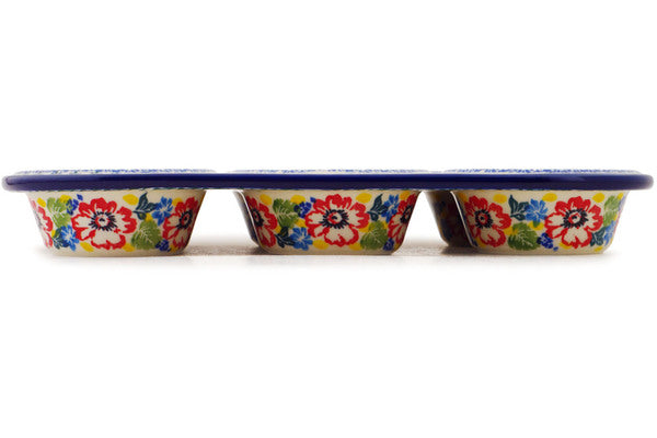 This Polish pottery Muffin Pan is made by Ceramika Artystyczna workshop in Boleslawiec, Poland. Manufacturer item number H6764Q. It is 1½" high and measures 11½" by 8". The capacity of this Muffin Pan is 17.6 oz when filled to rim and it weighs 2.7 lbs. The pattern was designed by artist Teresa Liana. It is part of the Hummingbird Meadow Collection.