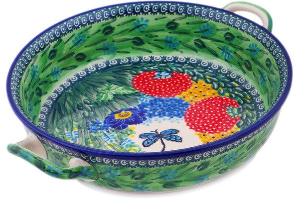 Polish Pottery 11" Round Baker with Handles Dragonfly Delight UNIKAT