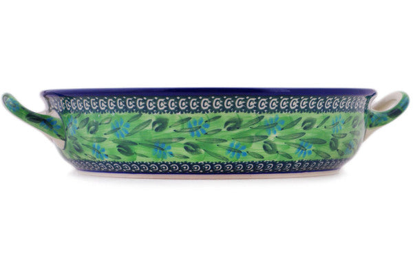 This Polish pottery Round Baker with Handles is made by Ceramika Artystyczna workshop in Boleslawiec, Poland. Manufacturer item number H6909Q. It is 2" high and measures 11" by 9¼". The capacity of this Round Baker with Handles is 46.0 oz when filled to rim and it weighs 2.3 lbs. The pattern was designed by artist Teresa Liana. It is part of the Dragonfly Delight Collection.