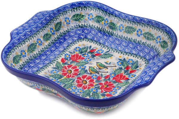 Polish Pottery 11" Square Baker with Handles Green Bird Meadow UNIKAT