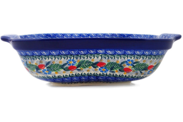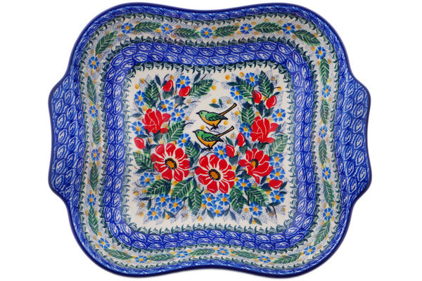 This Polish pottery Square Baker with Handles is made by Ceramika Artystyczna workshop in Boleslawiec, Poland. Manufacturer item number H5249D. It is 2½" high and measures 11¼" by 9¾". The capacity of this Square Baker with Handles is 77.3 oz when filled to rim and it weighs 3.0 lbs. The pattern was designed by artist Maria Starzyk. It is part of the Green Bird Meadow Collection.