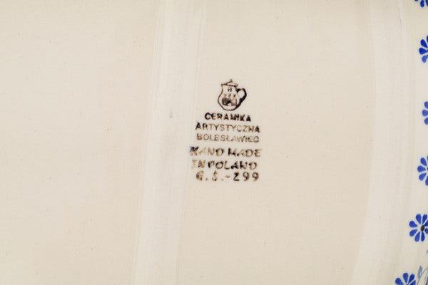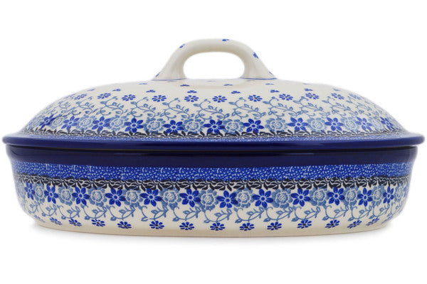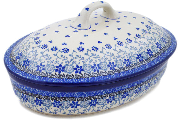 This Polish pottery Baker with Cover is made by Ceramika Artystyczna workshop in Boleslawiec, Poland. Manufacturer item number H6006Q. It is 5½" high and measures 12" by 8½". The capacity of this Baker with Cover is 54.1 oz when filled to rim and it weighs 6.1 lbs. It is part of the First Snow Collection.