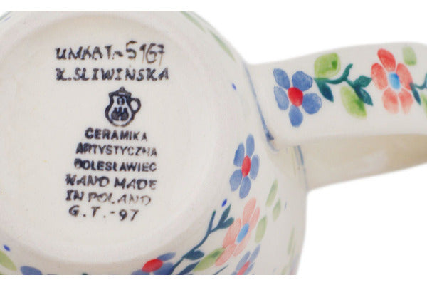 This is a Polish pottery Unikat (Signature) Mug, which means that it has been hand painted with both sponges and brushes and it is signed by the artist who painted it. Unikat pieces are the most intricate works of art. Larger Unikat items take hours of very careful work to finish.