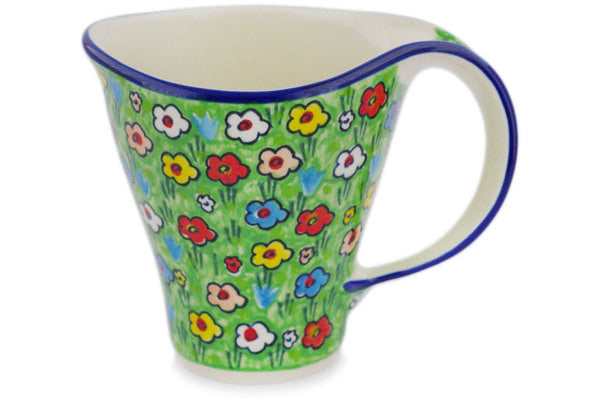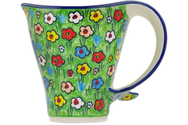 This Polish pottery Mug is made by Ceramika Artystyczna workshop in Boleslawiec, Poland. Manufacturer item number H2933R. It is 4¾" high and measures 5½" by 4". The capacity of this Mug is 12.3 oz when filled to rim and it weighs 0.9 lbs. It is part of the Whimsical Garden Collection.