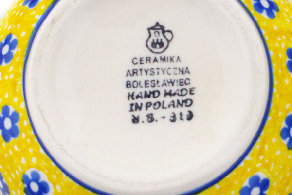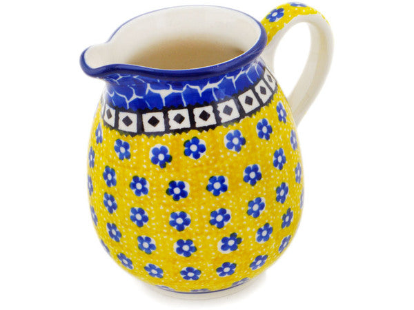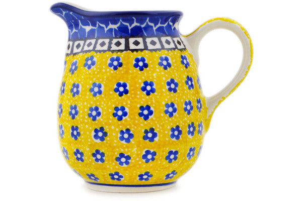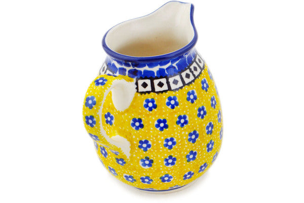 This Polish pottery Pitcher is made by Ceramika Artystyczna workshop in Boleslawiec, Poland. Manufacturer item number H5093Q. It is 4¼" high and measures 5" by 3½". The capacity of this Pitcher is 11.8 oz when filled to rim and it weighs 0.7 lbs. The pattern was designed by artist Teresa Liana. It is part of the Sunburst Daisies Collection.