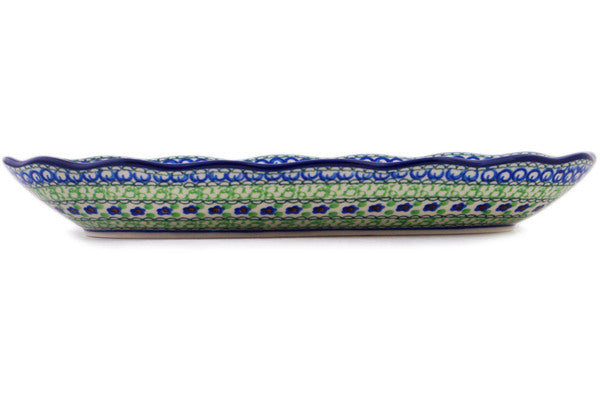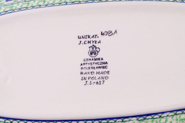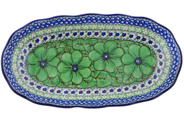This Polish pottery Platter is made by Ceramika Artystyczna workshop in Boleslawiec, Poland. Manufacturer item number H6813Q. It is 1½" high and measures 12½" by 6¼". The weight of this Platter is 1.7 lbs. The pattern was designed by artist Jacek Chyla. It is part of the Green Pansies Collection.