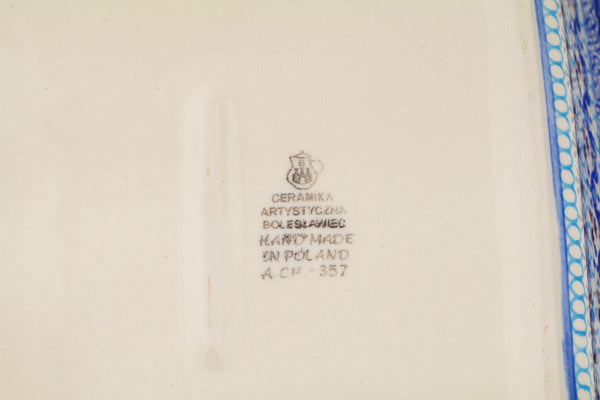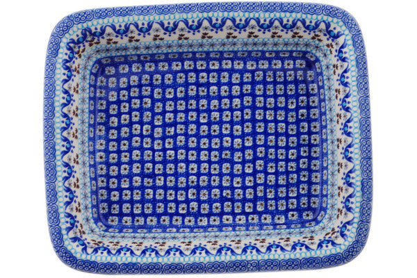 This Polish pottery Rectangular Baker is made by Ceramika Artystyczna workshop in Boleslawiec, Poland. Manufacturer item number H5650Q. It is 2¾" high and measures 12" by 10". The capacity of this Rectangular Baker is 82.2 oz when filled to rim and it weighs 3.9 lbs. The pattern was designed by artist Krystyna Dacyszyn. It is part of the Blue Ice Collection.