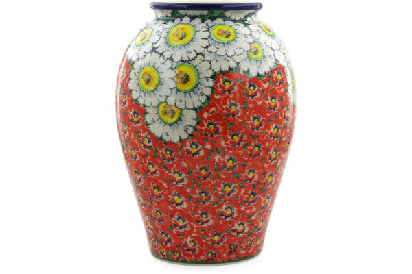 This Polish pottery Vase is made by Ceramika Artystyczna workshop in Boleslawiec, Poland. Manufacturer item number H2022K. It is 12¼" high and measures 8¾" by 8¾". The weight of this Vase is 6.3 lbs. The pattern was designed by artist Teresa Liana. It is part of the Sweet Red Petals Collection.