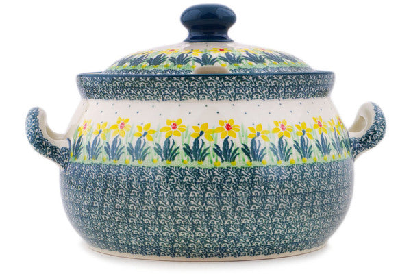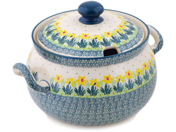 This Polish pottery Tureen is made by Ceramika Artystyczna workshop in Boleslawiec, Poland. Manufacturer item number H6481Q. It is 7½" high and measures 11" by 9". The capacity of this Tureen is 121.7 oz when filled to rim and it weighs 6.2 lbs. It is part of the Summer Meadow Collection.
