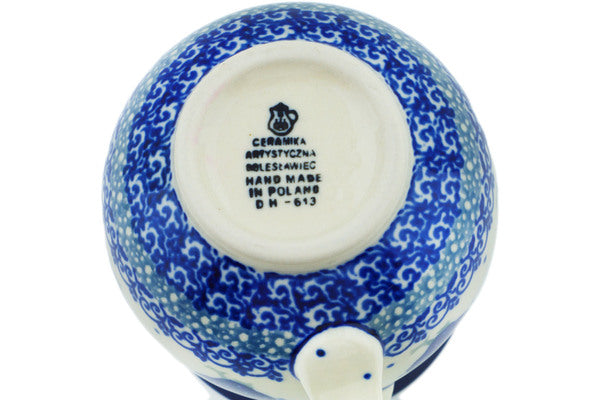 This Polish pottery Bubble Mug is made by Ceramika Artystyczna workshop in Boleslawiec, Poland. Manufacturer item number H4811M. It is 3¾" high and measures 5" by 3¾". The capacity of this Bubble Mug is 12.2 oz when filled to rim and it weighs 0.8 lbs. It is part of the Blue Chicken Collection.