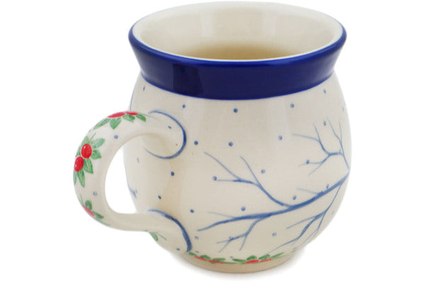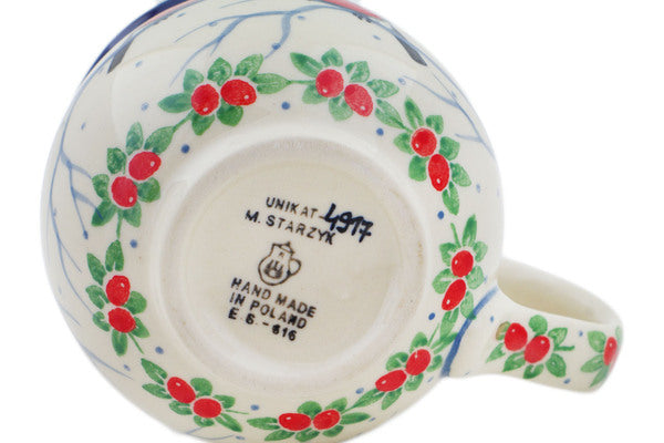 This Polish pottery Bubble Mug is made by Ceramika Artystyczna workshop in Boleslawiec, Poland. Manufacturer item number H1036Q. It is 3¾" high and measures 5" by 3¾". The capacity of this Bubble Mug is 12.2 oz when filled to rim and it weighs 0.8 lbs. The pattern was designed by artist MARIA STARZYK. It is part of the Bullfinch On Rowan Winter Berries Collection.