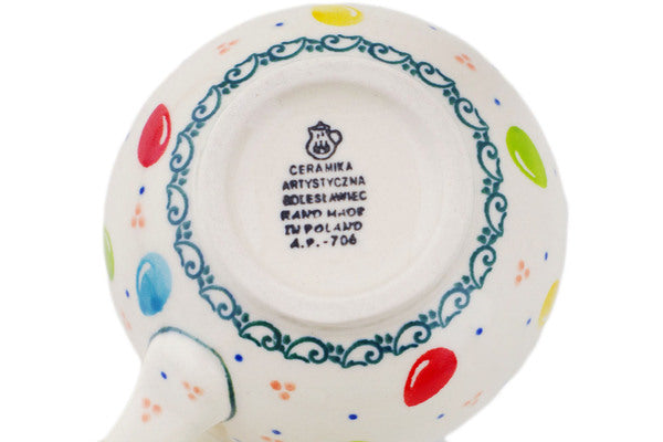 This Polish pottery Bubble Mug is made by Ceramika Artystyczna workshop in Boleslawiec, Poland. Manufacturer item number H9107Q. It is 3¾" high and measures 5" by 3¾". The capacity of this Bubble Mug is 12.2 oz when filled to rim and it weighs 0.8 lbs. It is part of the Egg Hunt Collection.