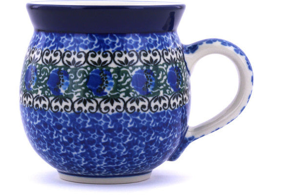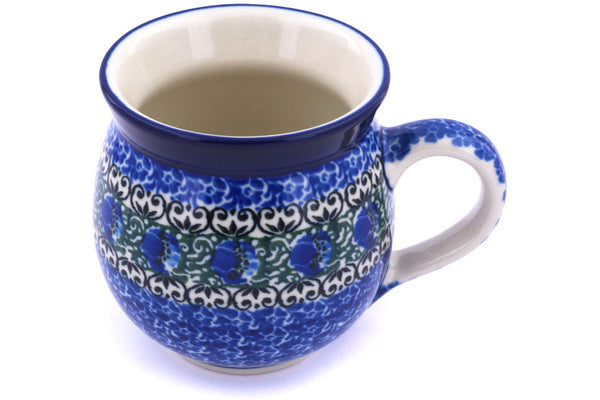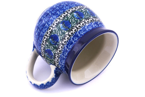 This Polish pottery Bubble Mug is made by Ceramika Artystyczna workshop in Boleslawiec, Poland. Manufacturer item number H9187G. It is 3¾" high and measures 5" by 3¾". The capacity of this Bubble Mug is 12.2 oz when filled to rim and it weighs 0.8 lbs. The pattern was designed by artist Teresa Liana. It is part of the Peacock Feather Collection.