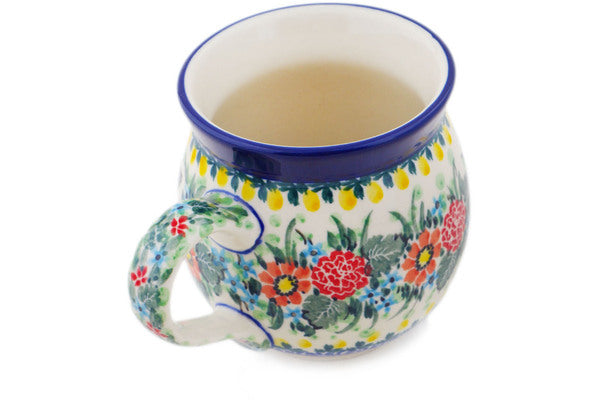 This Polish pottery Bubble Mug is made by Ceramika Artystyczna workshop in Boleslawiec, Poland. Manufacturer item number H1786R. It is 3¾" high and measures 5" by 3¾". The capacity of this Bubble Mug is 12.2 oz when filled to rim and it weighs 0.8 lbs. The pattern was designed by artist Teresa Liana. It is part of the Solo Hummingbird Collection.