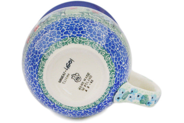 This Polish pottery Bubble Mug is made by Ceramika Artystyczna workshop in Boleslawiec, Poland. Manufacturer item number H8102Q. It is 3¾" high and measures 5" by 3¾". The capacity of this Bubble Mug is 12.2 oz when filled to rim and it weighs 0.8 lbs. The pattern was designed by artist Teresa Liana. It is part of the Splendid Mariposa Collection.