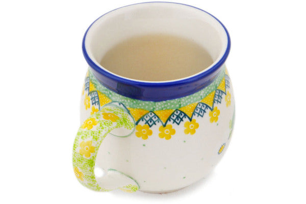 This Polish pottery Bubble Mug is made by Ceramika Artystyczna workshop in Boleslawiec, Poland. Manufacturer item number H1797R. It is 3¾" high and measures 5" by 3¾". The capacity of this Bubble Mug is 12.2 oz when filled to rim and it weighs 0.8 lbs. The pattern was designed by artist Maria Starzyk. It is part of the Spring On The Branch Collection.