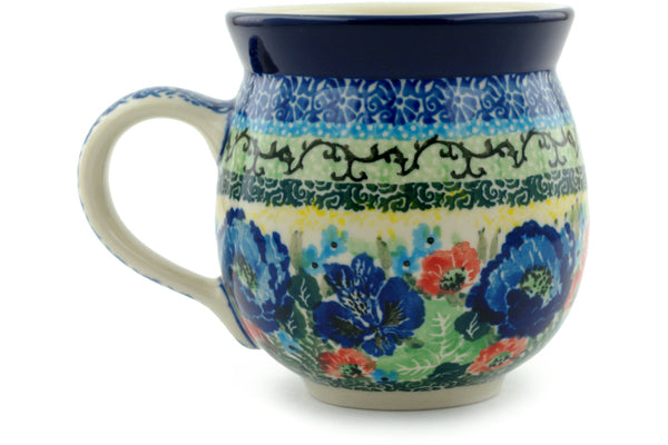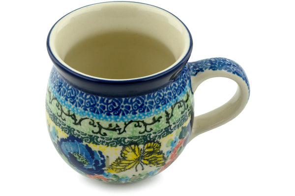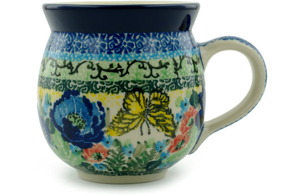 This Polish pottery Bubble Mug is made by Ceramika Artystyczna workshop in Boleslawiec, Poland. Manufacturer item number H0153I. It is 3¾" high and measures 5" by 3¾". The capacity of this Bubble Mug is 12.2 oz when filled to rim and it weighs 0.8 lbs. The pattern was designed by artist Teresa Liana. It is part of the Yellow Monarch Meadow Collection.