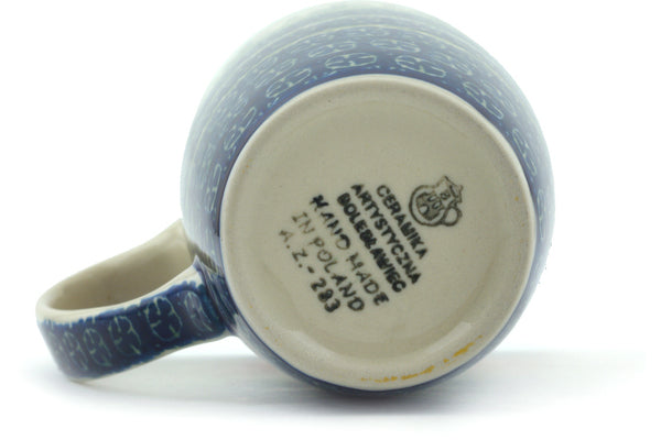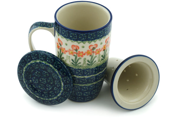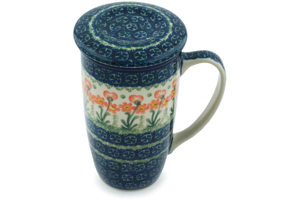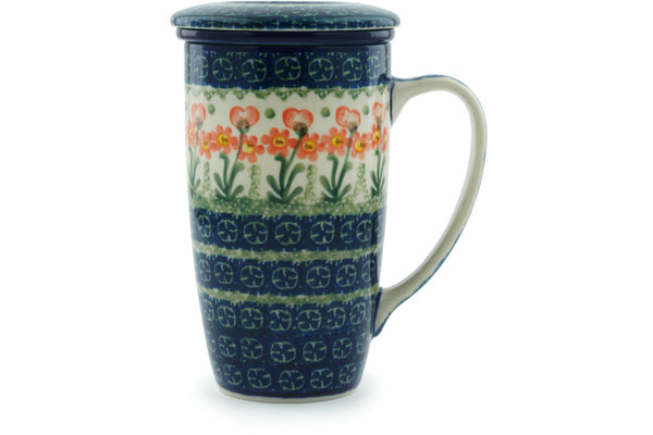 This Polish pottery Brewing Mug is made by Ceramika Artystyczna workshop in Boleslawiec, Poland. Manufacturer item number H0534I. It is 6" high and measures 4¾" by 3½". The capacity of this Brewing Mug is 12.9 oz when filled to rim and it weighs 1.5 lbs. The pattern was designed by artist Jolanta Okraska. It is part of the Peach Spring Daisy Collection.