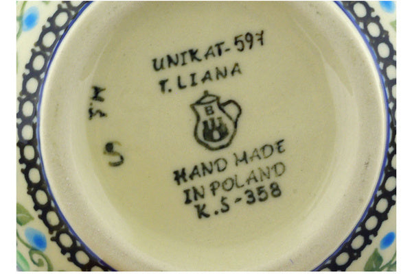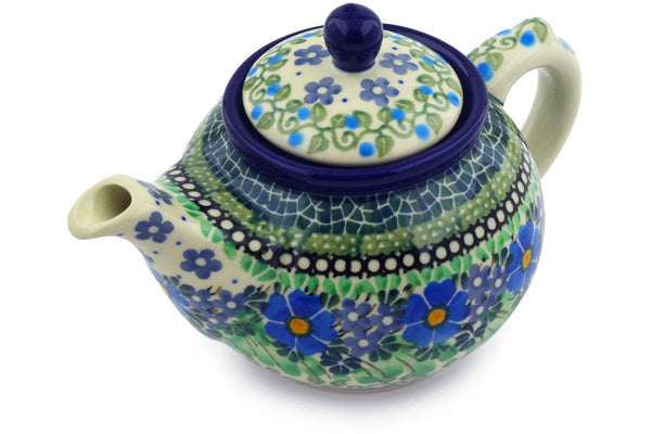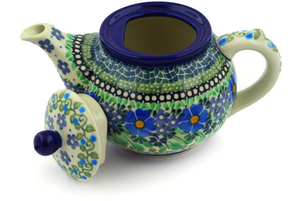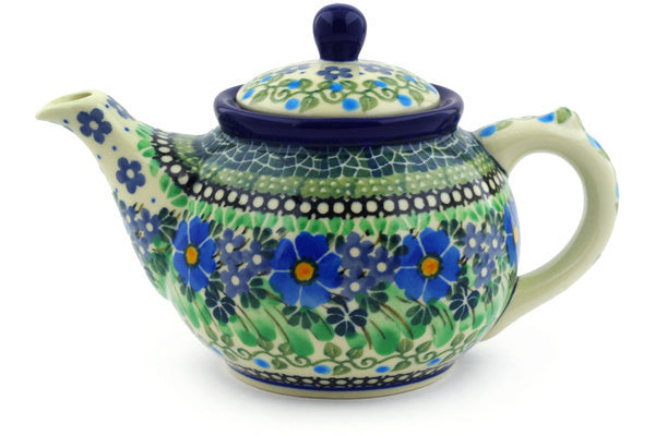 This Polish pottery Tea or Coffee Pot is made by Ceramika Artystyczna workshop in Boleslawiec, Poland. Manufacturer item number H6328E. It is 4¼" high and measures 6¾" by 4¼". The capacity of this Tea or Coffee Pot is 13.5 oz when filled to rim and it weighs 0.9 lbs. The pattern was designed by artist Teresa Liana. It is part of the Hiking Song Collection.
