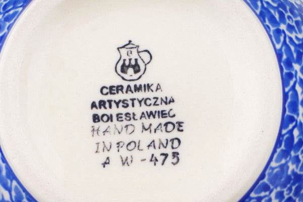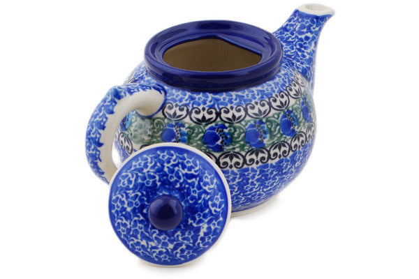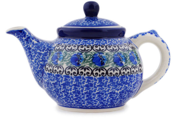 This Polish pottery Tea or Coffee Pot is made by Ceramika Artystyczna workshop in Boleslawiec, Poland. Manufacturer item number H5382Q. It is 4¼" high and measures 6¾" by 4¼". The capacity of this Tea or Coffee Pot is 13.5 oz when filled to rim and it weighs 0.9 lbs. The pattern was designed by artist Teresa Liana. It is part of the Peacock Feather Collection.