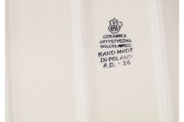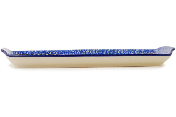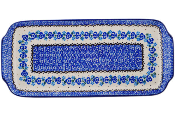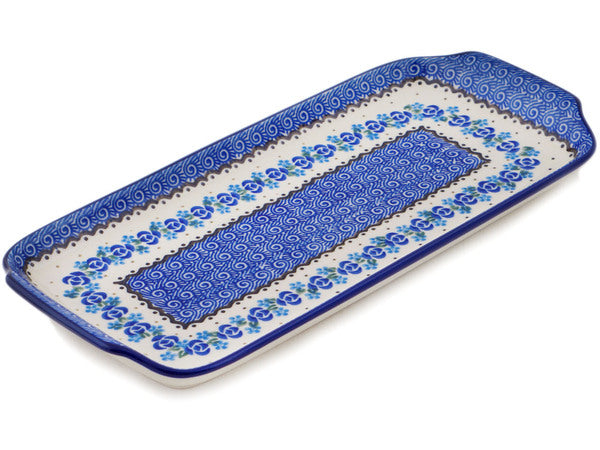 This Polish pottery Platter with Handles is made by Ceramika Artystyczna workshop in Boleslawiec, Poland. Manufacturer item number H5106Q. It is 1¼" high and measures 12½" by 5¾". The weight of this Platter with Handles is 1.7 lbs. The pattern was designed by artist Maria Starzyk. It is part of the Blue Bud Sea Collection.