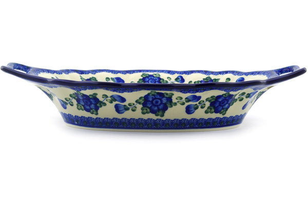 This Polish pottery Platter with Handles is made by Ceramika Artystyczna workshop in Boleslawiec, Poland. Manufacturer item number H4267F. It is 2¾" high and measures 13½" by 9". The capacity of this Platter with Handles is 23.7 oz when filled to rim and it weighs 2.2 lbs. The pattern was designed by artist Jolanta Okraska. It is part of the Blue Poppies Collection.