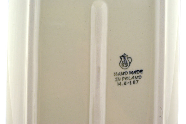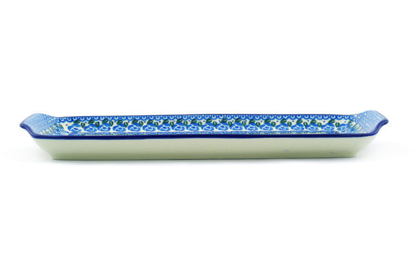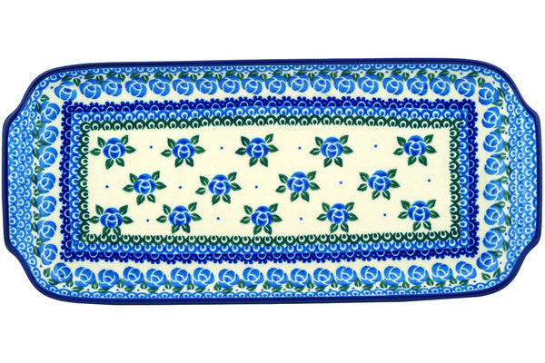 This Polish pottery Platter with Handles is made by Ceramika Artystyczna workshop in Boleslawiec, Poland. Manufacturer item number H4153F. It is 1¼" high and measures 12½" by 5¾". The weight of this Platter with Handles is 1.7 lbs. The pattern was designed by artist Maria Starzyk. It is part of the Bluebuds Collection.