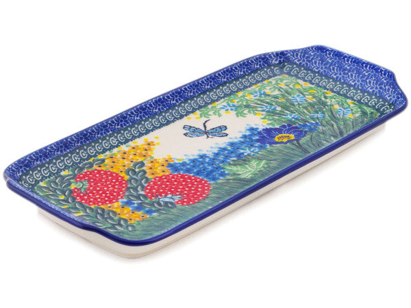 This Polish pottery Platter with Handles is made by Ceramika Artystyczna workshop in Boleslawiec, Poland. Manufacturer item number H6903Q. It is 1¼" high and measures 12½" by 5¾". The weight of this Platter with Handles is 1.7 lbs. The pattern was designed by artist Teresa Liana. It is part of the Dragonfly Delight Collection.